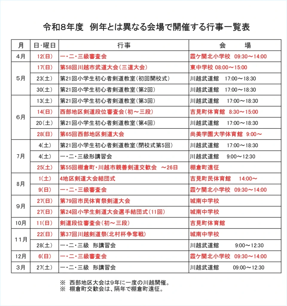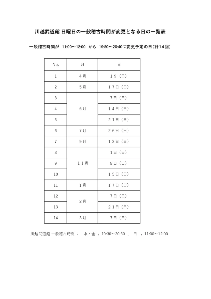 川越武道館日曜日の一般稽古時間が変更となる日の一覧